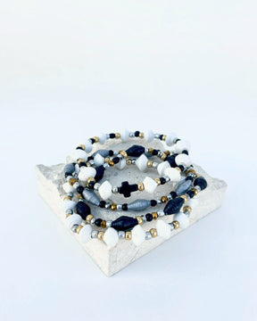 The Mirielle Paper Bead Bracelet Set features hand-rolled beads crafted from recycled newspaper, making each piece both meaningful and unique. Designed in a versatile palette of black, white, silver, and gold, these bracelets effortlessly complement any outfit. More than just beautiful accessories, they’re conversation starters—every compliment is a chance to share the story of the Haitian artisans whose lives are positively impacted through this work. Wear them stacked together, one at a time, or mix and match for a look that’s all your own.